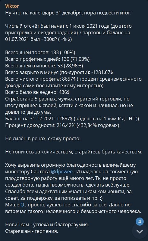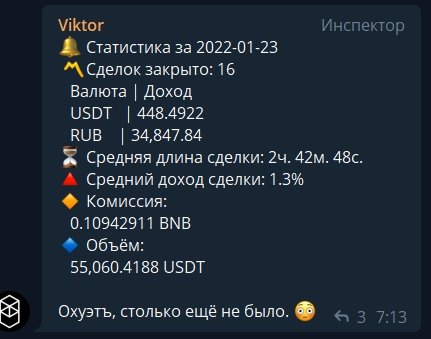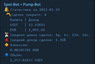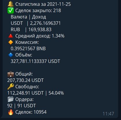 Работает по гибкой стратегии усреднения, имея обширное количество дополнительных настроек и опций, напрямую влияющих на итоговый профит и стратегию в целом, таких как: трейлинг-стоп; закрытие позиции по принципу частичной распродажи в зависимости от её веса - это позволяет тянуть среднюю продажу выше при пампе монеты; телеграм-уведомления в личный канал при полном исполнении ордера на продажу, а также статистику по аккаунту в реальном времени; прогрессивную grid-сетку для последующих усреднений, зависящую как от пользовательских настроек, так и от рыночной динамики, которую видит бот; подхватывание пользовательских ордеров на покупку и усреднение и дальнейшая работа с ними, динамические настройки, автоматически влияющие на торговые параметры в зависимости от рынка и прочее.