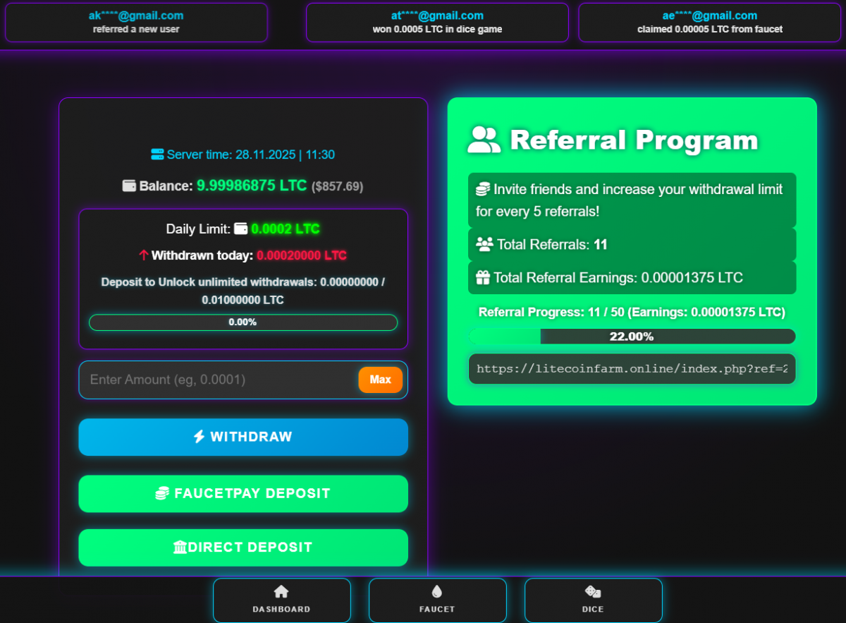 За каждые 5 рефералов добавляет к выводу 5000 литоши и главное платит !!!