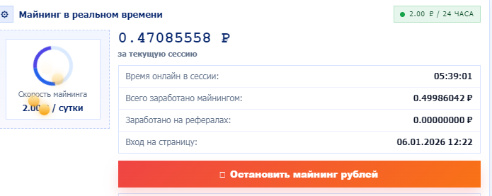 - рублевый ПСЕВДОмайнинг, дающий 2 рубля в день без вложений, с 25-ю уровнями повышения скорости по 20% каждый;