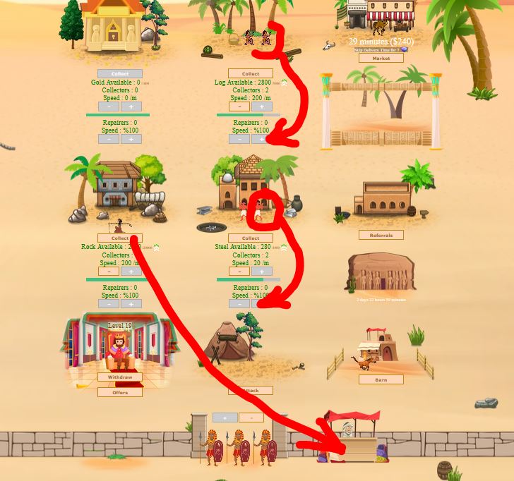 6. за кувшин у здания рефералов ежедневно дают воинов - выстройте для защиты 3-х у входа. Если на вас нападут, не удаляйте сообщение о нападении иначе опять нападут. Сами можете напасть, когда накопите воинов, но после нападения обязательно на вас нападут - стройте защиту.