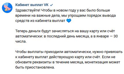 Чтобы выплаты приходили автоматически, нужно привязать к кабинету выплат действующую карту или счёт. Если не обновите реквизиты в течение месяца, монетизация может быть приостановлена.
