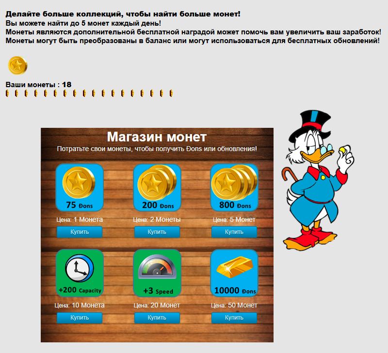 — картинка "Скрудж Макдак" генератор монет 120 Dons/час с ёмкостью 520 Dons. Когда появляется на картинке воришка с мешком, то кликайте на него и получите еще Dons;